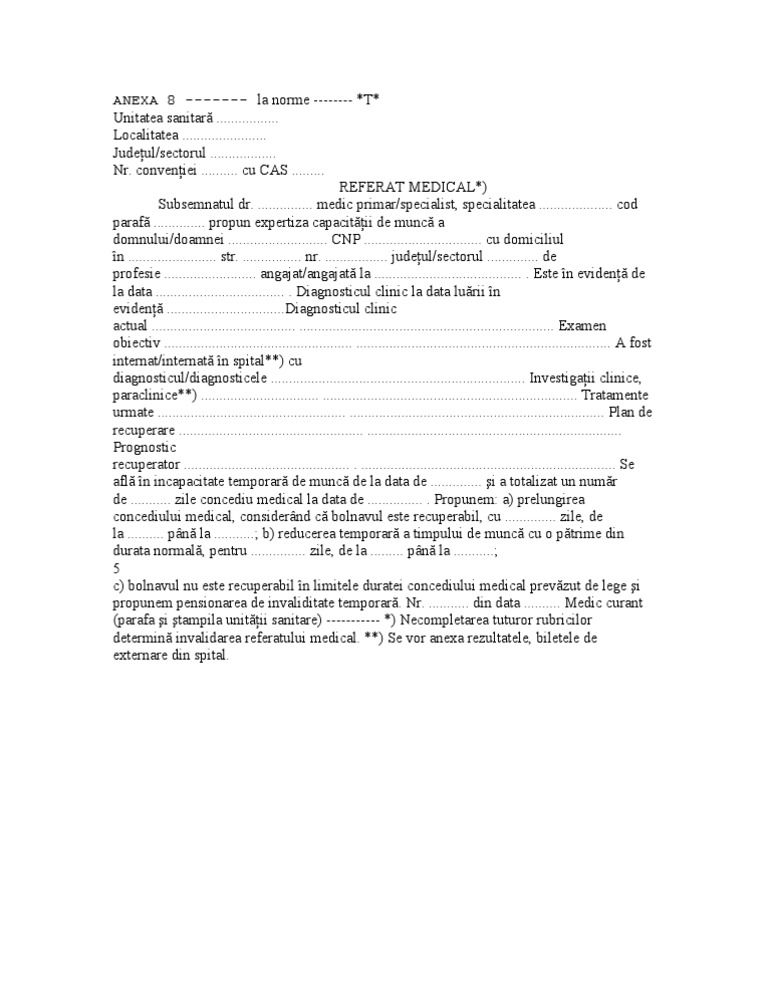 În situaţia în care nu este disponibil un medic fără obligaţii contractuale confirmate de către consiliile colegiilor teritoriale ale medicilor, se poate prelua activitatea şi de către medicii aflaţi în relaţie. * *) se vor anexa rezultatele, biletele de ieşire din spital. Necompletarea tuturor rubricilor determina invalidarea referatului medical **)se vor anexa rezultatele, biletele de externare din spital medic curant (parafa si stamplia sanitara).